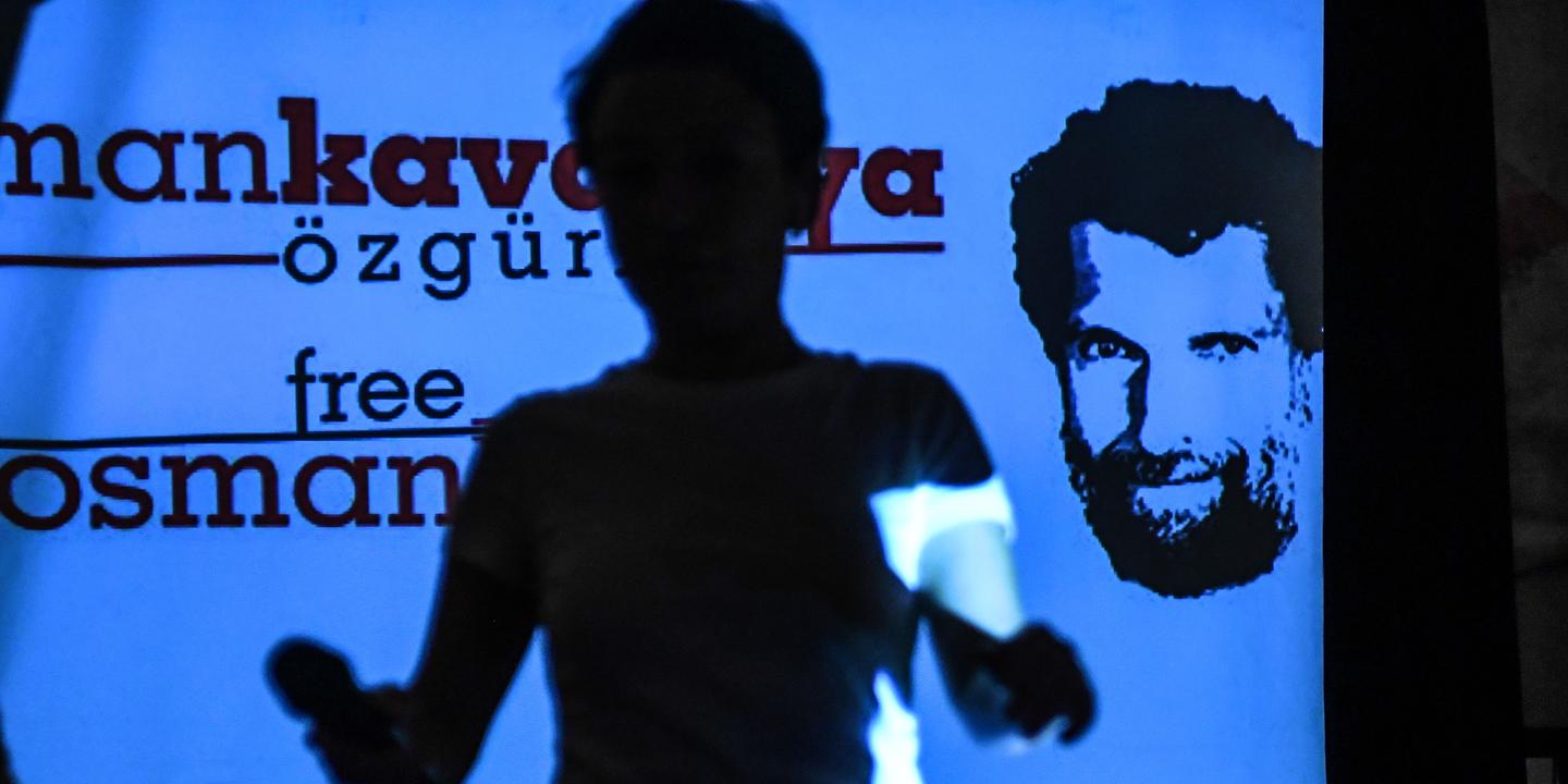 Dans cette photo darchive prise le 31 octobre 2018, un participant passe devant un écran avec une image de lhomme daffaires et philanthrope emprisonné Osman Kavala lors dune conférence de presse tenu… [+3106 chars]
