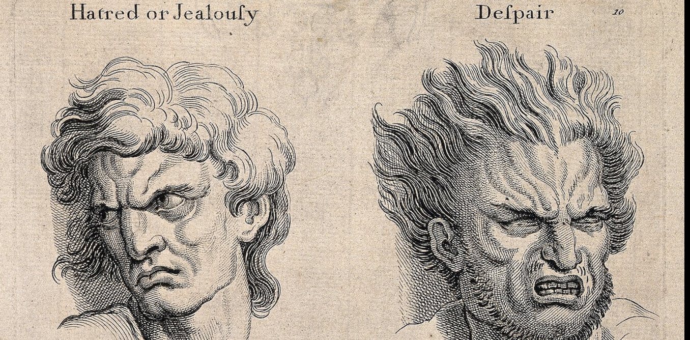Expressions faciales représentant la haine, la jalousie et le désespoir (gravure datées de 1760 environ).
